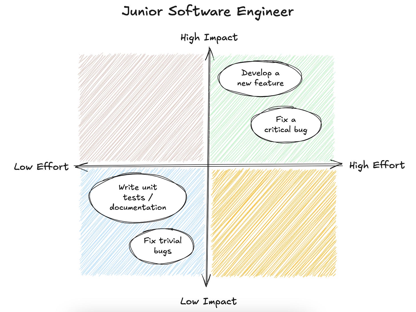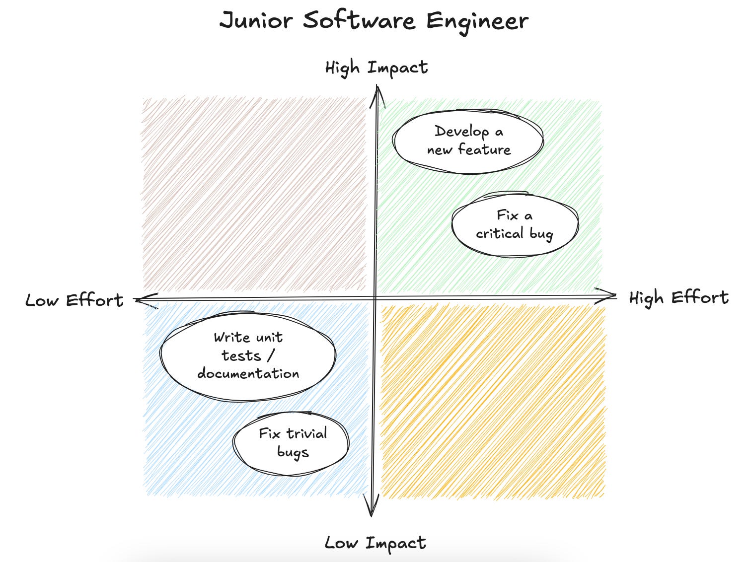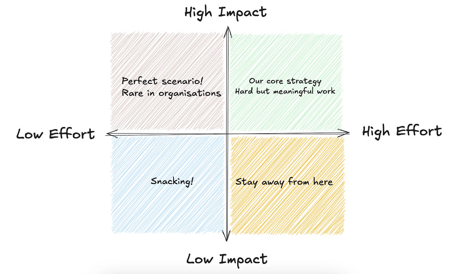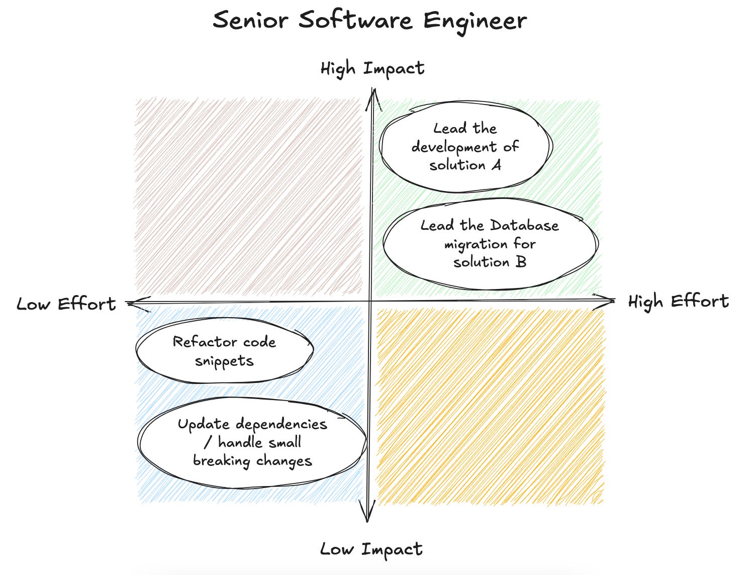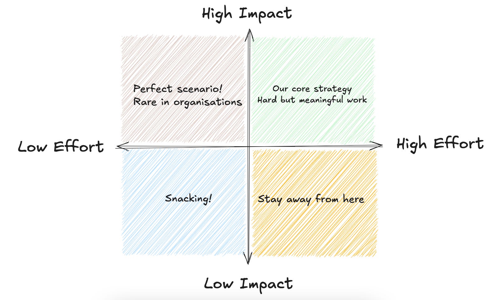 When working in an organisation, you’ll eventually run out of “perfect” tasks that are both high-impact and low-effort, which forces you to choose between: