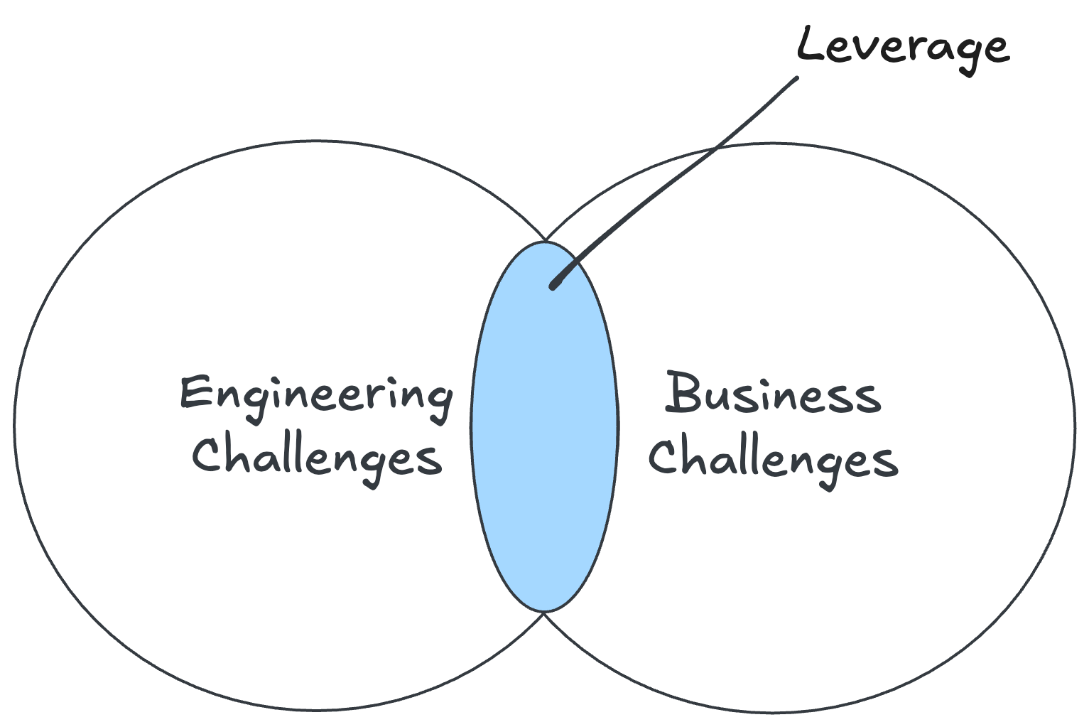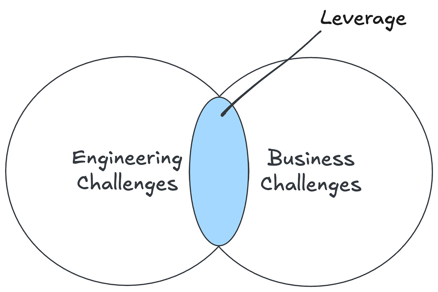 Engineering and business challenges don’t have to be mutually exclusive. The problems are at the intersection of a Venn diagram, where solving them moves the business forward and make an engineering impact. This is finding your leverage.