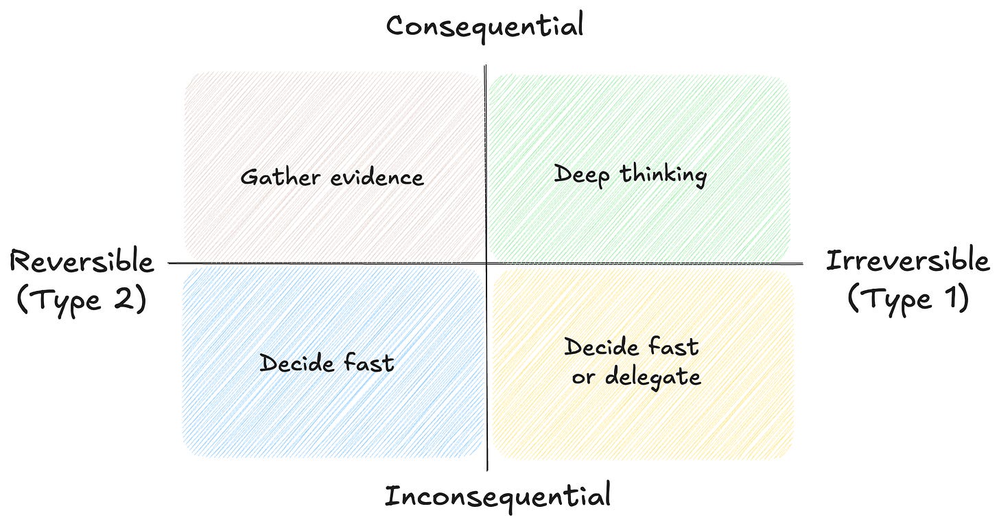 In startups, you’ll often be exposed more to the top-right quadrant: consequential and irreversible decisions. In larger companies, you’ll see more of the top-left quadrant: consequential but reversible decisions. However, you’ll face all sorts of decisions throughout your career regardless of your chosen environment.