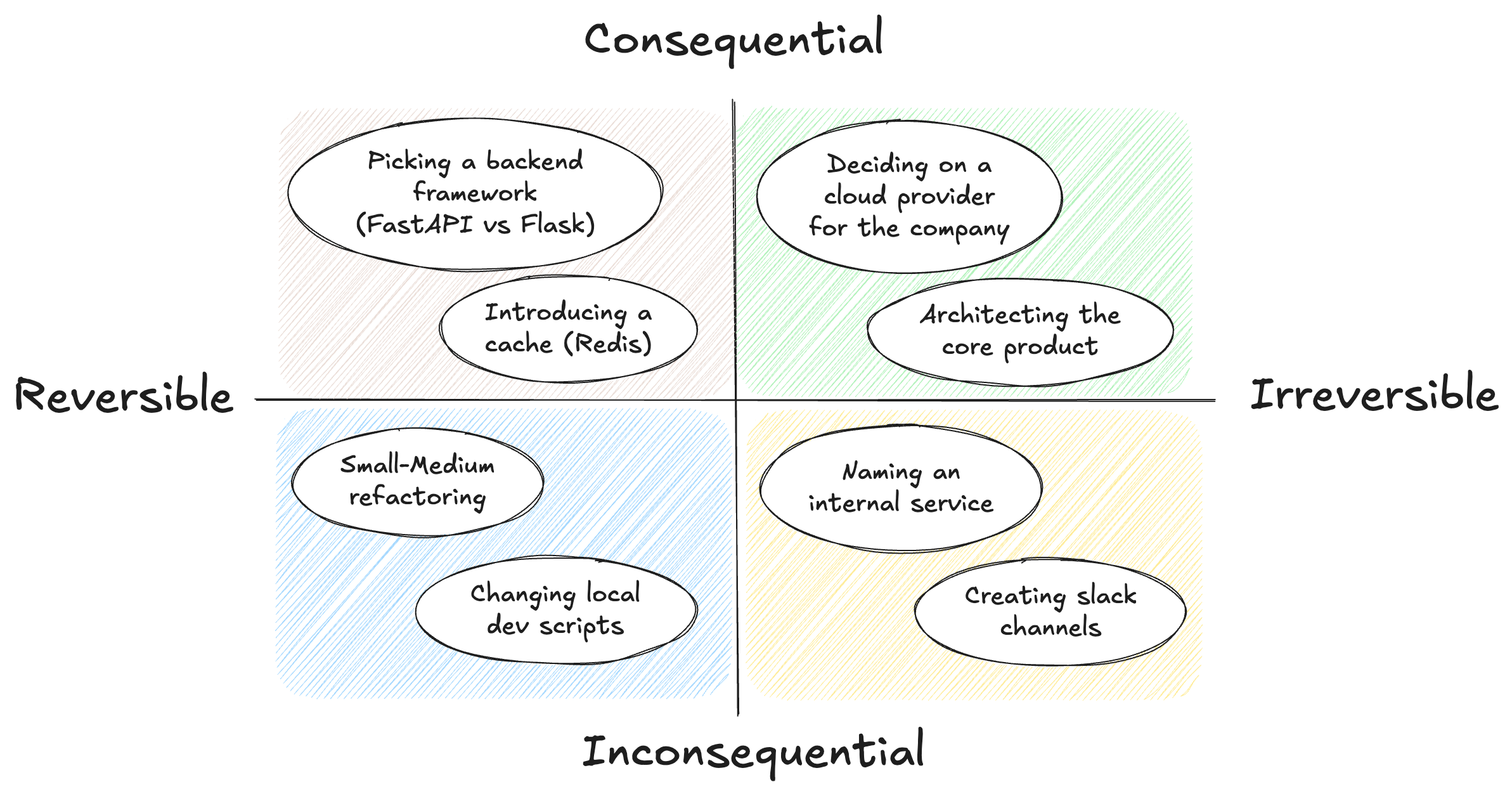 To build the right mental model, this diagram suggests the action based on two factors: reversibility and consequence. The top two quadrants represent high consequence to your team and the business, while the bottom two quadrants represent minimal consequence. The top-right quadrant represents “technical excellence”: high-consequence, irreversible decisions that require deep expertise and long-term thinking. The top-left represents “prototyping”. It’s for building a hypothesis and then running experiments to validate or nullify it, and explaining the results to other engineers. The bottom-left quadrant is for quick decisions on small items. Engineers don’t have to spend too much time on this, especially if it’s easy to undo. The bottom-right quadrant can also be delegated or decided quickly. It might be useful to communicate those kinds of decisions with your teammates, but it certainly doesn’t require hours of meetings back-and-forth.