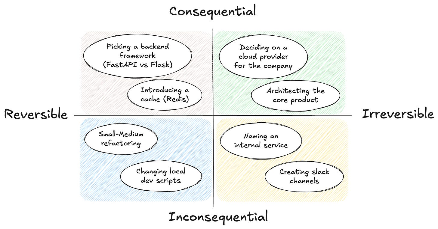 Junior engineers often get blocked here, sometimes due to lack of experience. That’s normal during onboarding/training. But it’s important to build this mental model when working on a busy team: senior engineers and tech leads won’t be available to review every Type 2 decision, especially when it’s reversible.