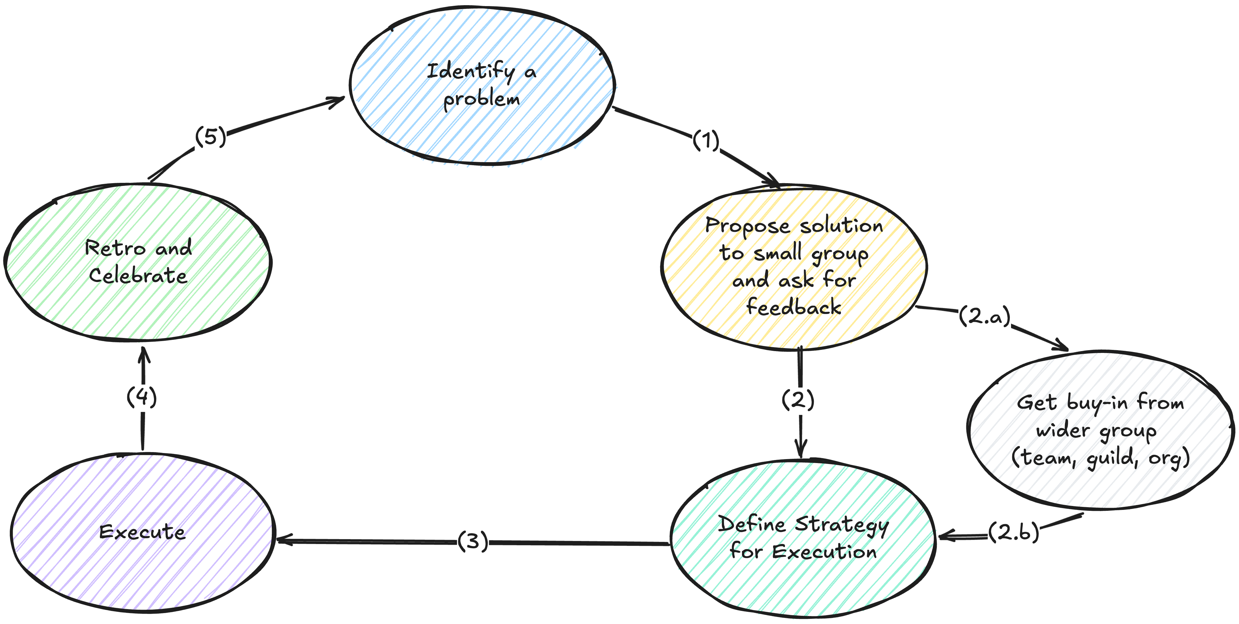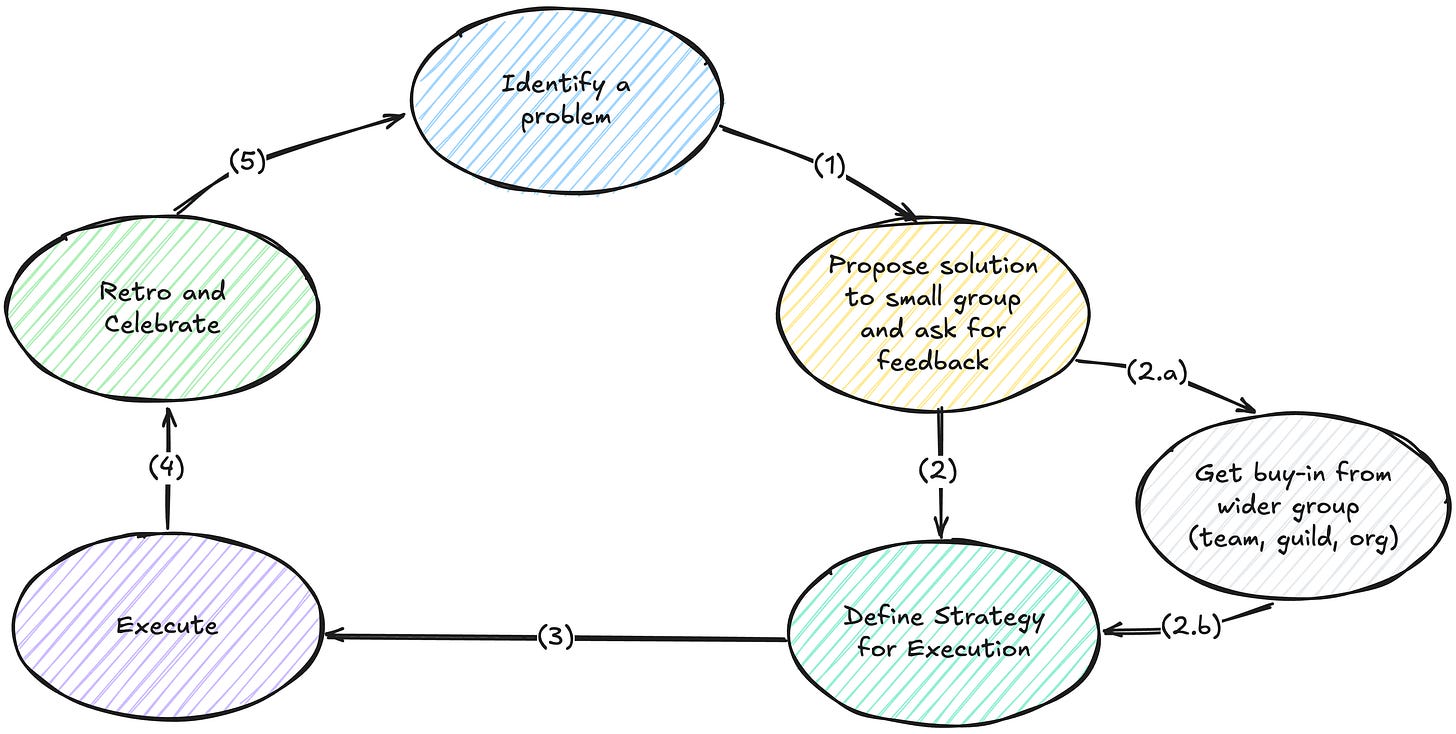 Depending on the scope and/or your organisation, you might need an additional “hop” to get buy-in for the initiative. If it requires support or involvement from a wider group (e.g., engineering org, backend guild, or platform team), it is important to go through that first before starting the initiative. You don’t want people to shoot down your solution mid-execution.